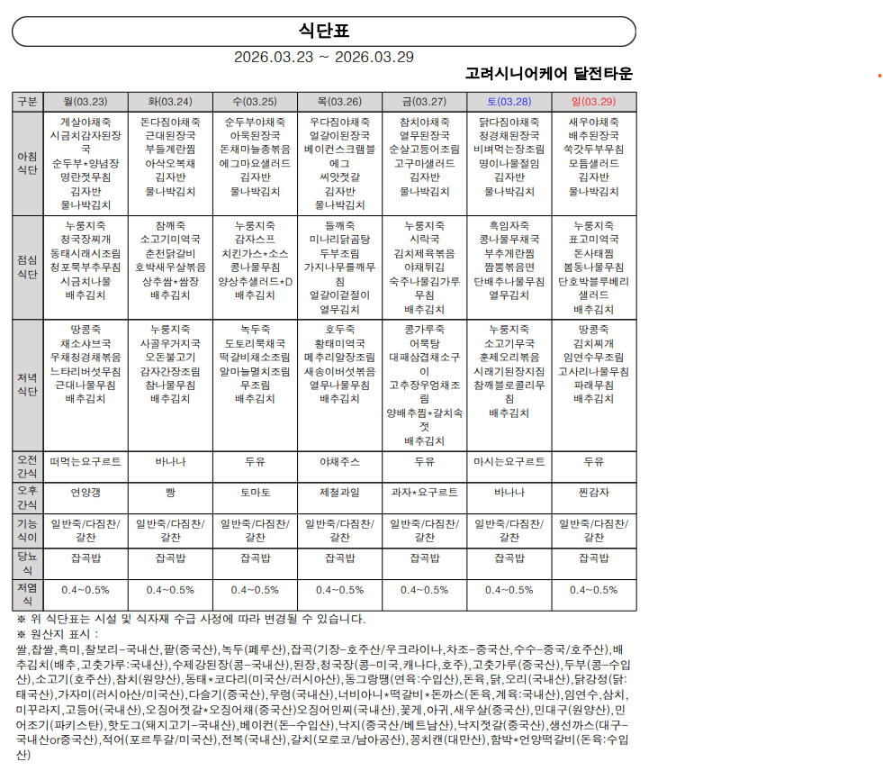 26년 3월 3주차 식단표