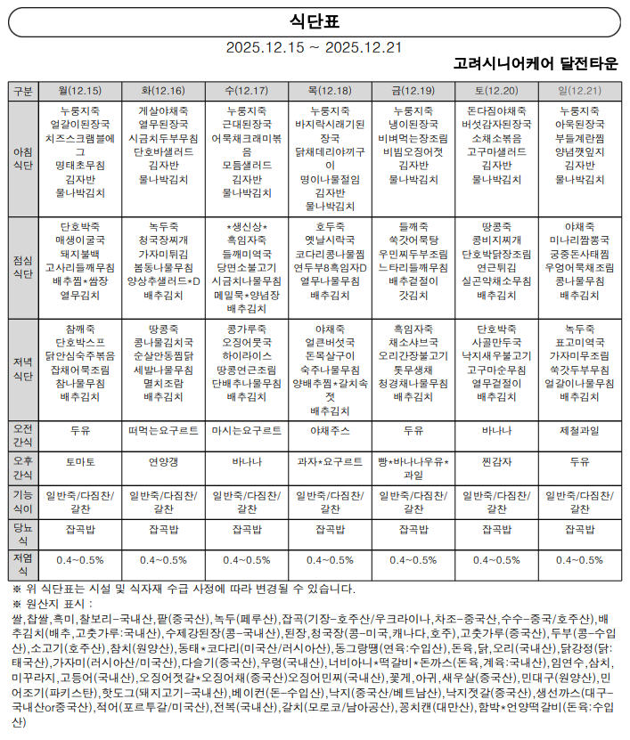 25년 12월 3주차 식단표
